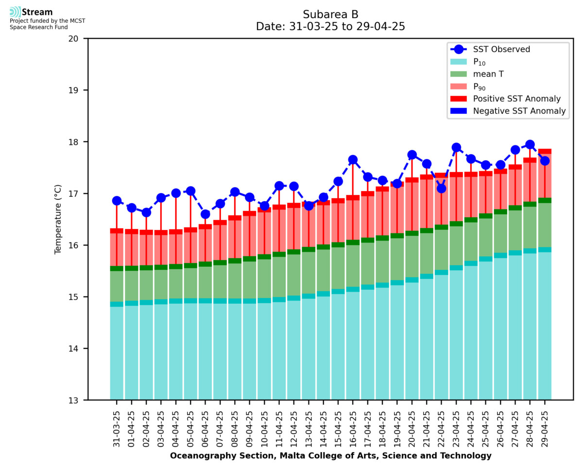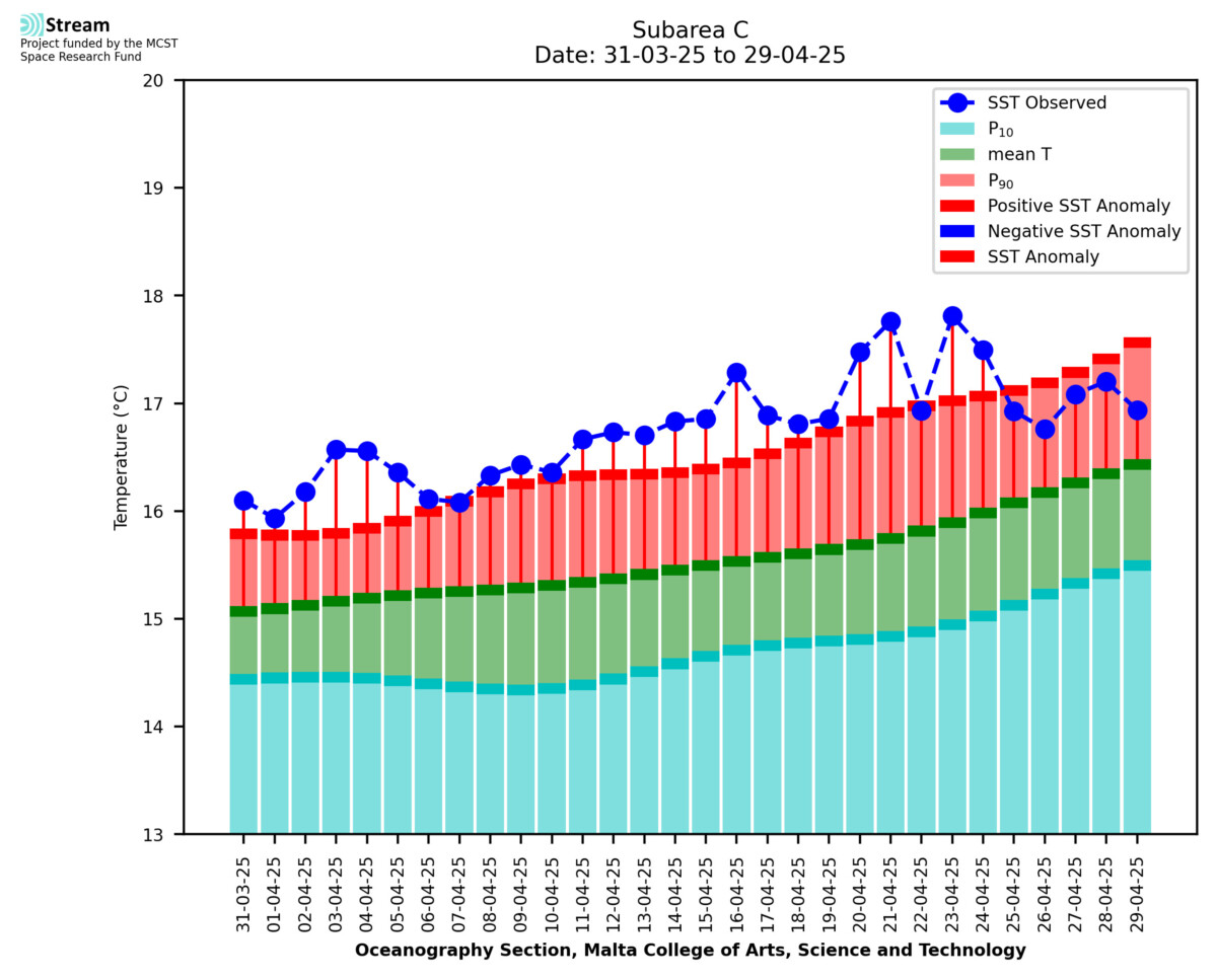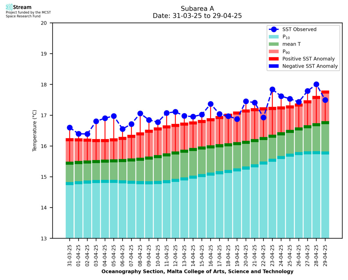 Elaborated by STREAM, the service provides daily analysis of sea surface temperature (SST) anomalies, including spatial maps for marine heat wave occurrence and intensity in the Malta shelf area. The service is based on ultra high resolution SST nighttime observations made by the infrared sensors mounted on different satellite platforms. Personalised user requests for detailed pixel-based data visualisation and access are available operationally on the STREAM web and mobile app.