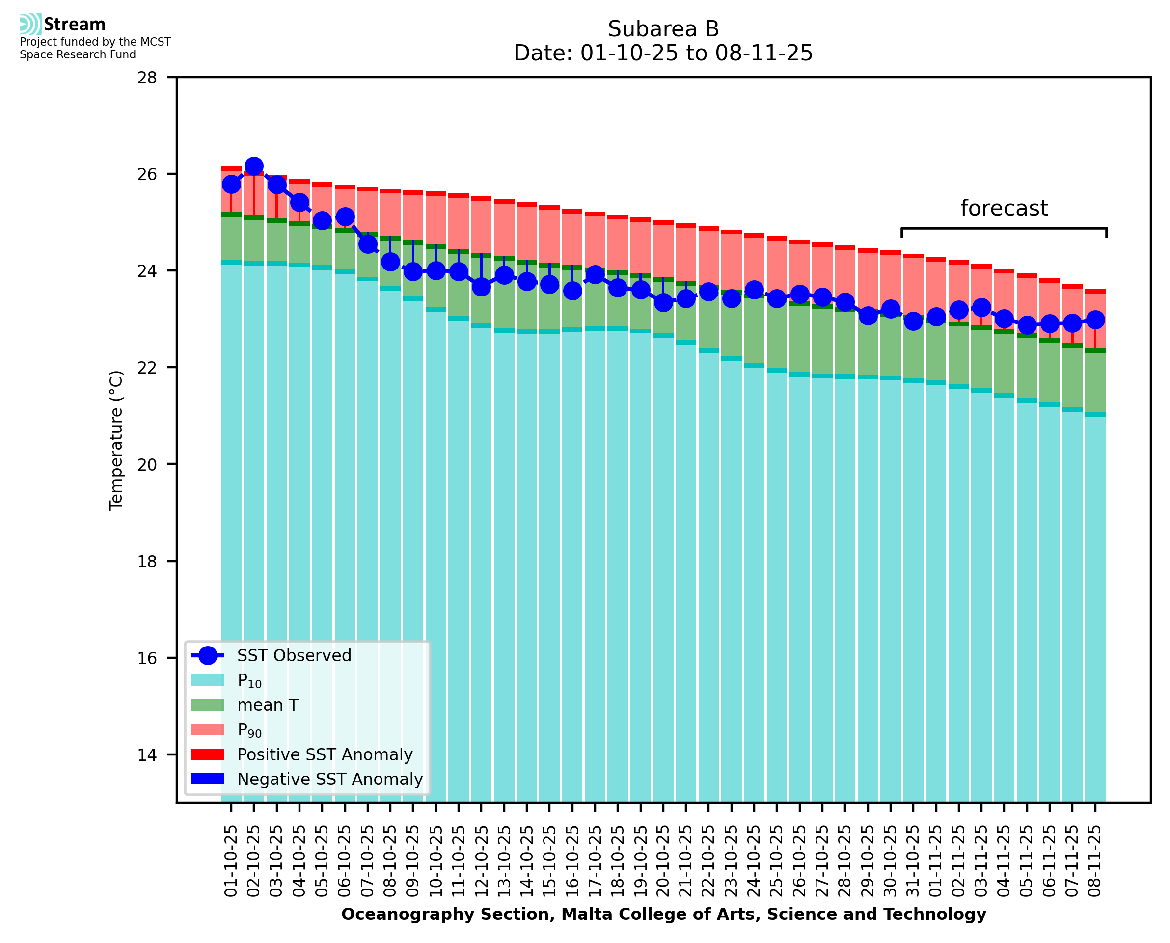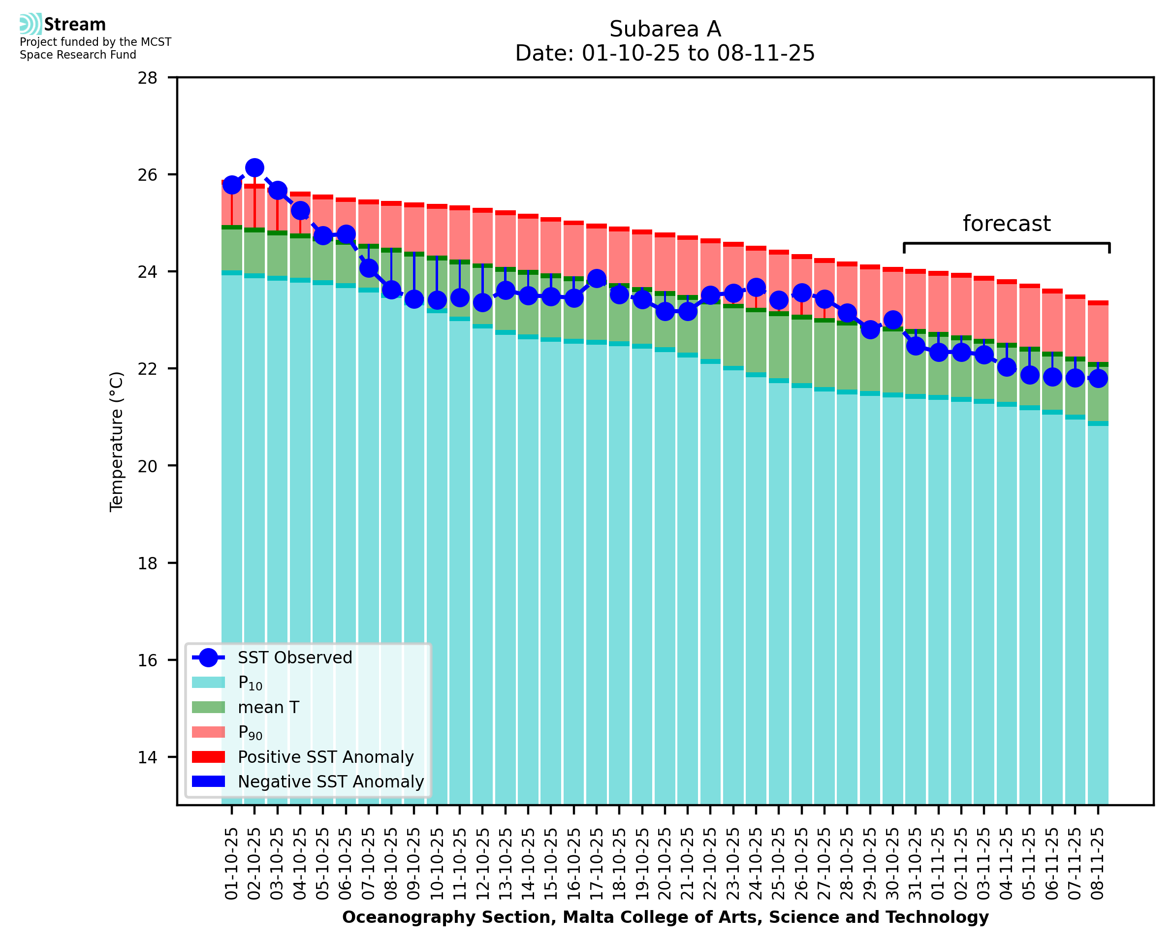 Elaborated by STREAM, the service provides daily analysis of sea surface temperature (SST) anomalies, including spatial maps for marine heat wave occurrence and intensity in the Malta shelf area. The service is based on ultra high resolution SST nighttime observations made by the infrared sensors mounted on different satellite platforms. Personalised user requests for detailed pixel-based data visualisation and access are available operationally on the STREAM web and mobile app.