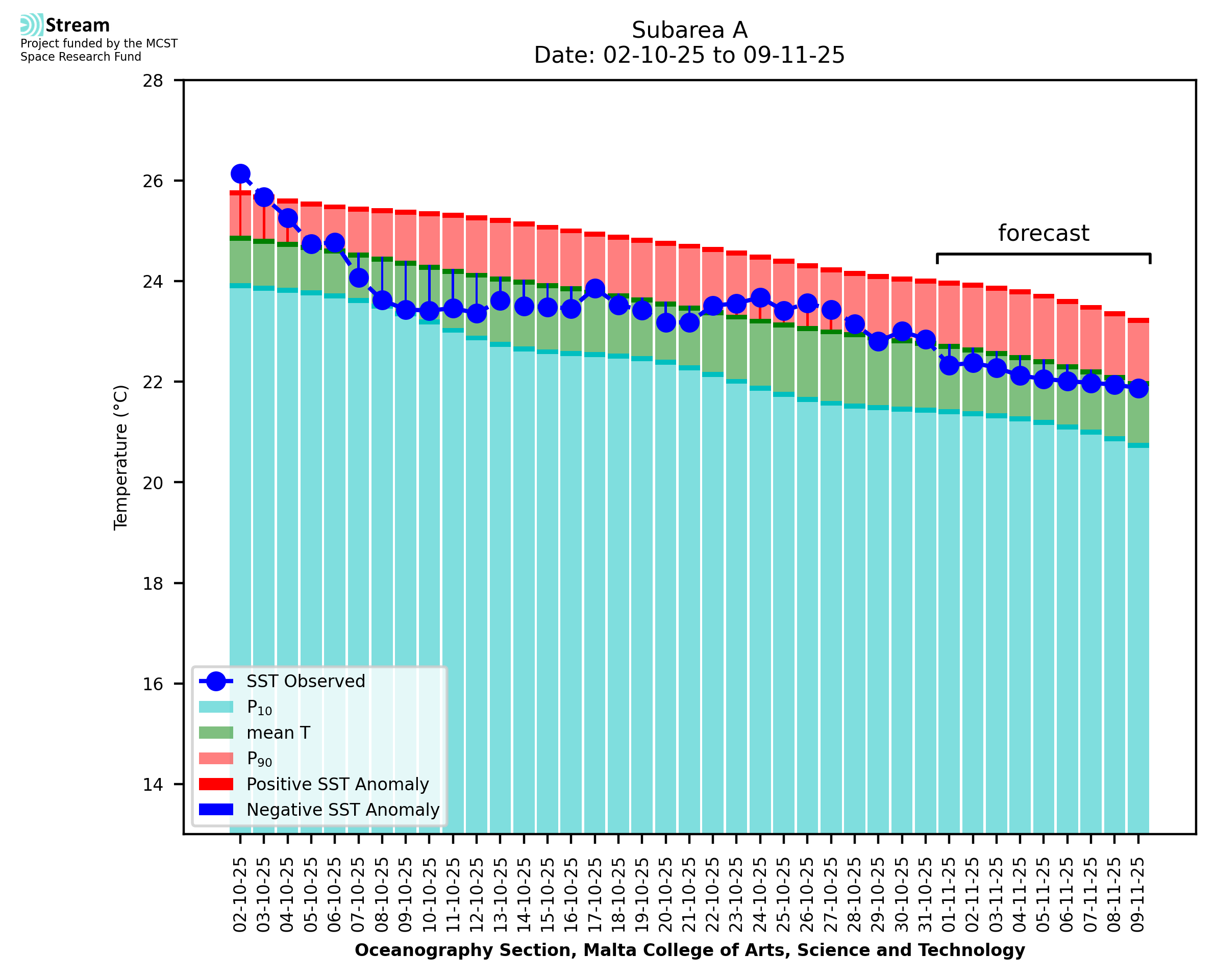 Elaborated by STREAM, the service provides daily analysis of sea surface temperature (SST) anomalies, including spatial maps for marine heat wave occurrence and intensity in the Malta shelf area. The service is based on ultra high resolution SST nighttime observations made by the infrared sensors mounted on different satellite platforms. Personalised user requests for detailed pixel-based data visualisation and access are available operationally on the STREAM web and mobile app.